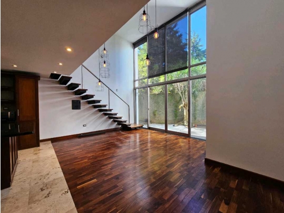 Acabados: Piso de madera y porcelanato, cocina con gabinetes de madera, top de cuarzo color negro, baños con porcelanato, espejos y mamparas de vidrio, ventanas con marco de aluminio y vidrio, gradas y zócalo de madera.