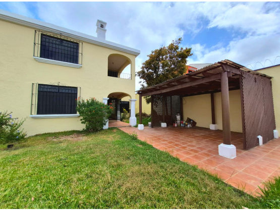 Habitación de servicio con acceso a servidumbre desde la calle, pérgola y jardín con inclinación descendente.